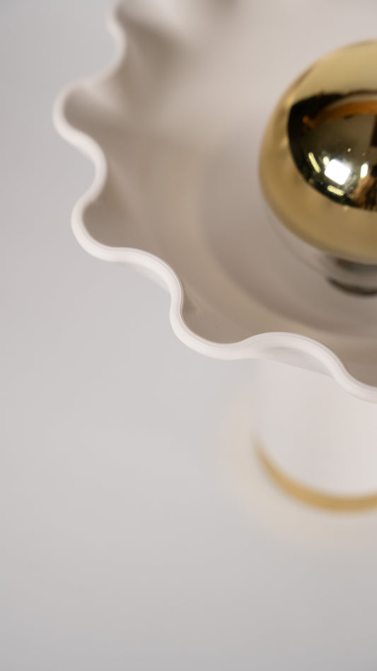 PERLA est une lampe minimaliste où l’ampoule, telle une perle, s’impose avec élégance. Inspirée des tuiles typique de Méditerranée, elle est imprimée en 3D en PLA (amidon de maïs) et ornée d’un liseré en laiton sablé.