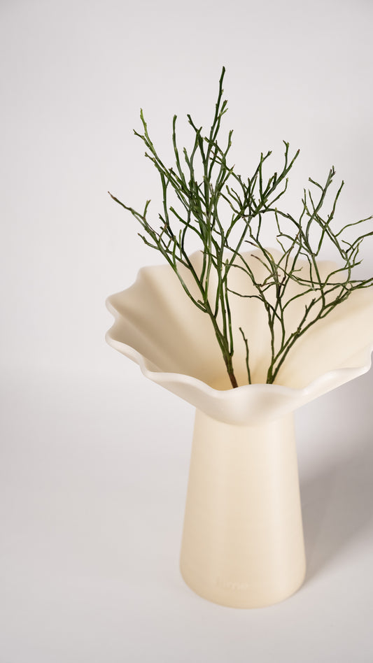 Le vase SANA est conçu en PLA, un biomatériau issu d’amidon de maïs, enrichi de coquilles Saint-Jacques recyclées et finement broyées. Imprimé en 3D, son design minimaliste et le filament biosourcé utilisé rendent hommage à l’un des symboles de la Méditerranée.