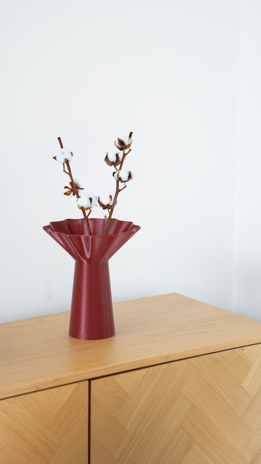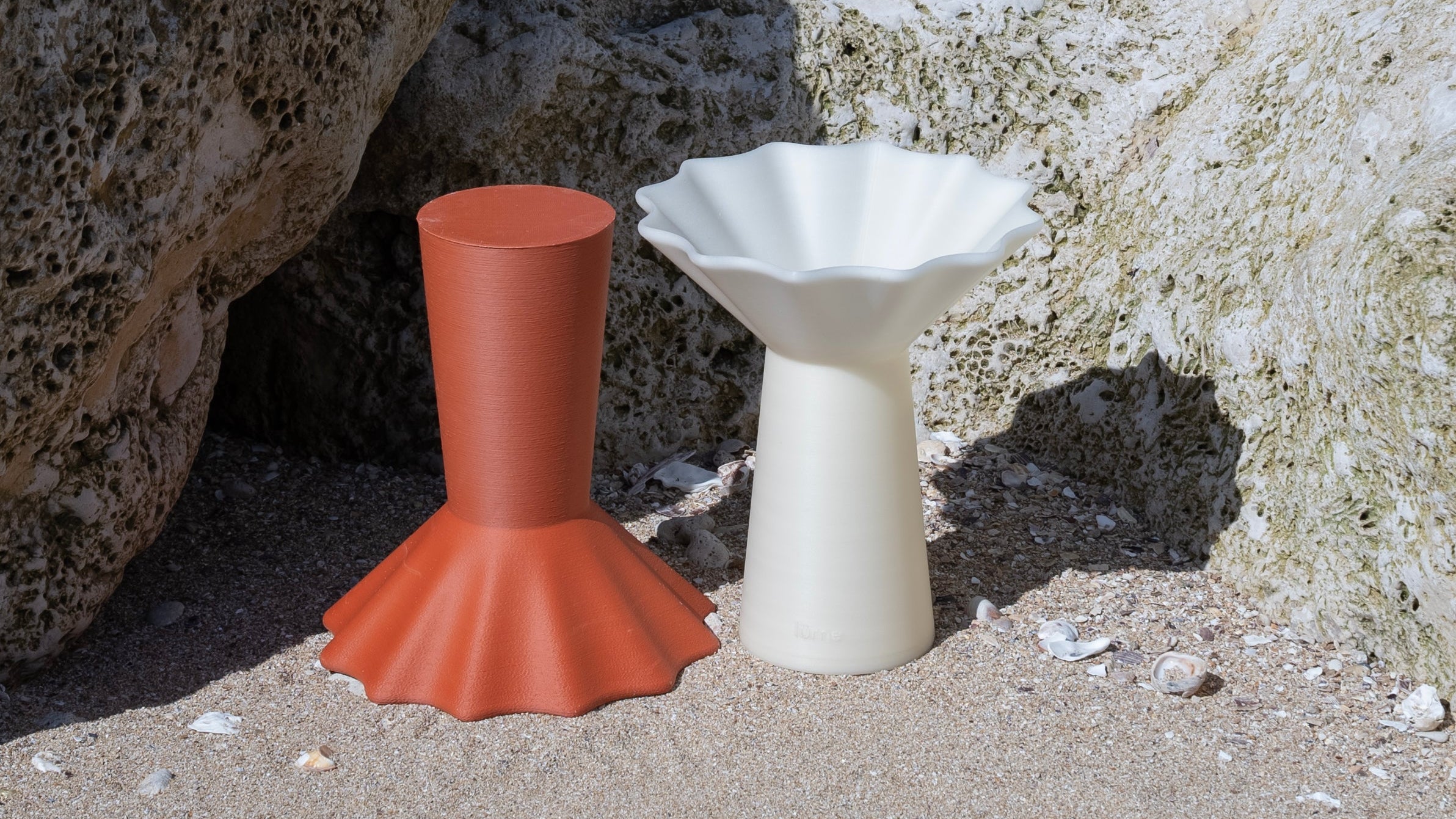 Le vase SANA est conçu en PLA, un biomatériau issu d’amidon de maïs, enrichi de coquilles Saint-Jacques recyclées et finement broyées. Imprimé en 3D, son design minimaliste et le filament biosourcé utilisé rendent hommage à l’un des symboles de la Méditerranée.