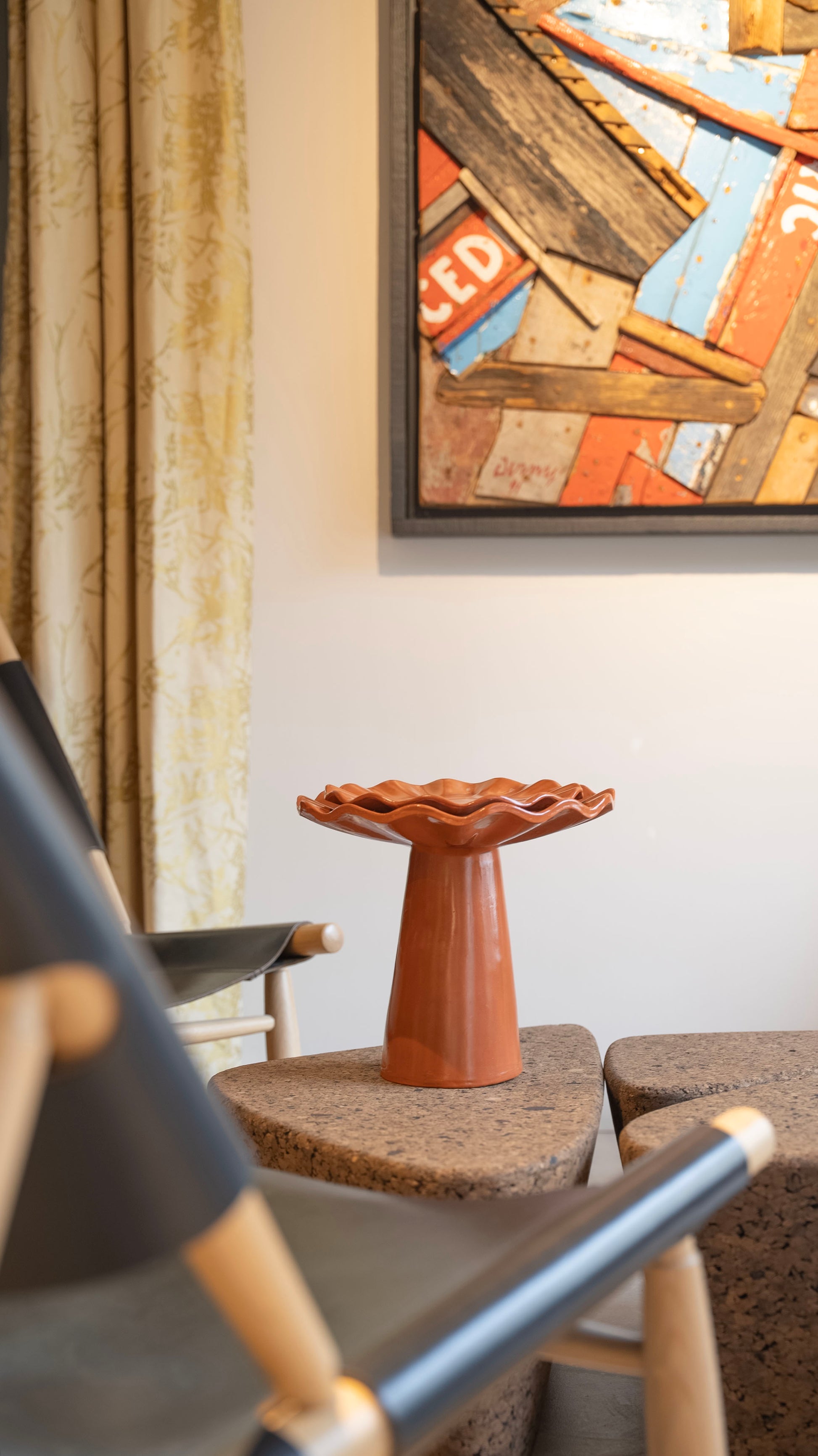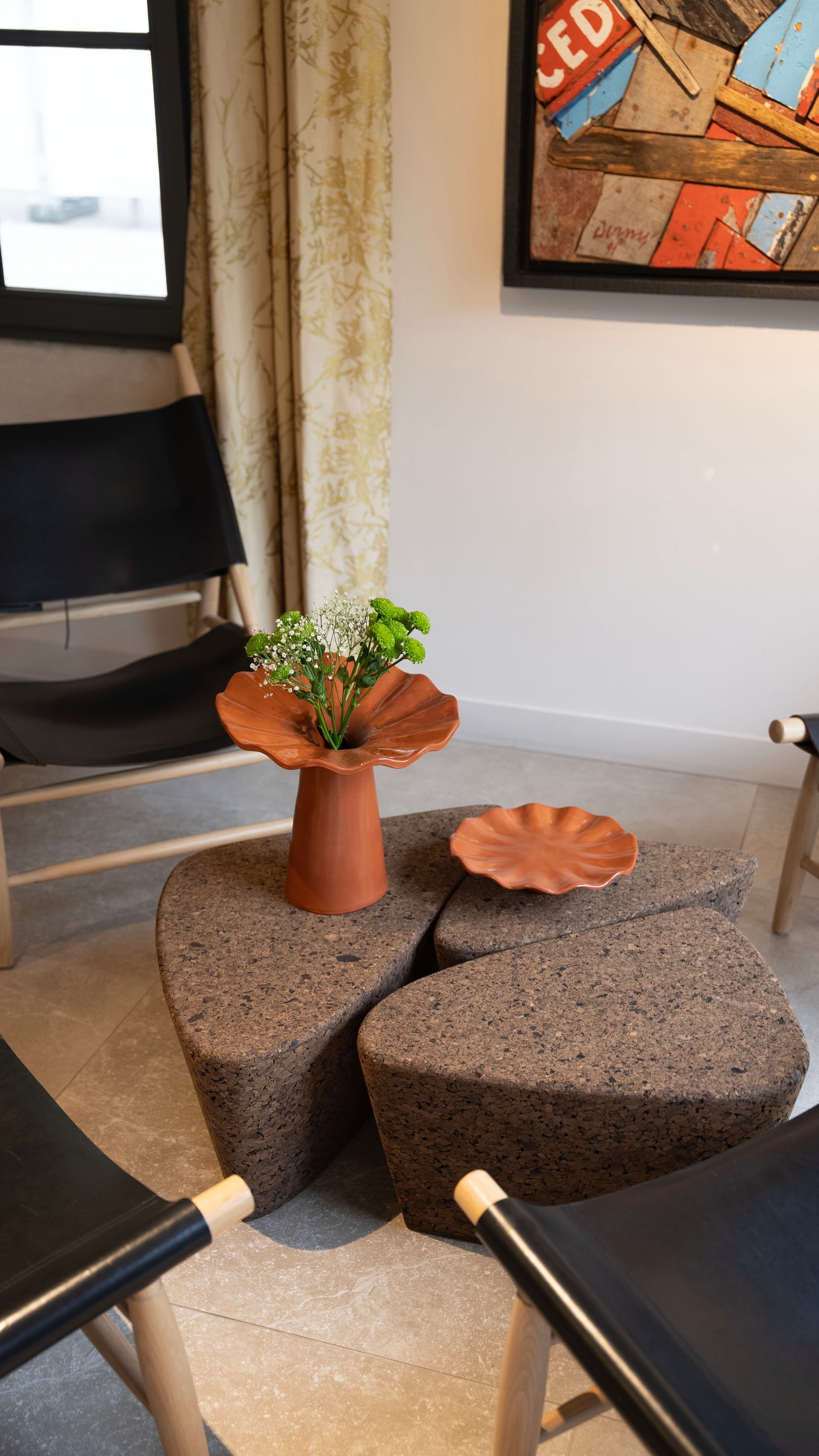Deux formes complémentaires qui se répondent et trouvent leur pleine expression une fois réunies : lorsque le vase est vide, la coupelle vient refermer le vase, transformant l’objet en une sculpture autonome, pensée pour rester visible et habitée.